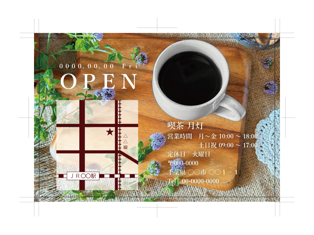 架空の喫茶店「喫茶月灯」のオープン告知を想定した、横型DMハガキのデザインをしました。