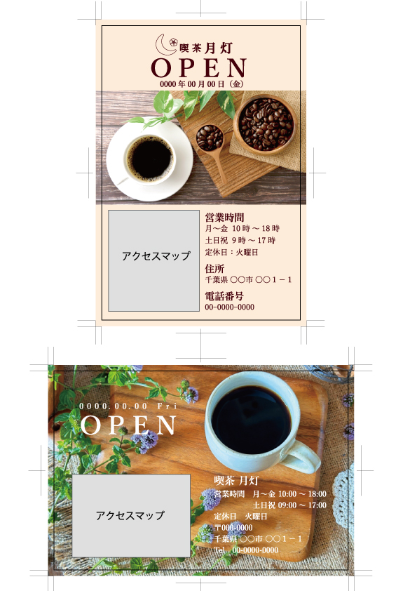 横型の方の左上「OPEN」の文字をもっとスペース大きく使って強調してもよさそう。