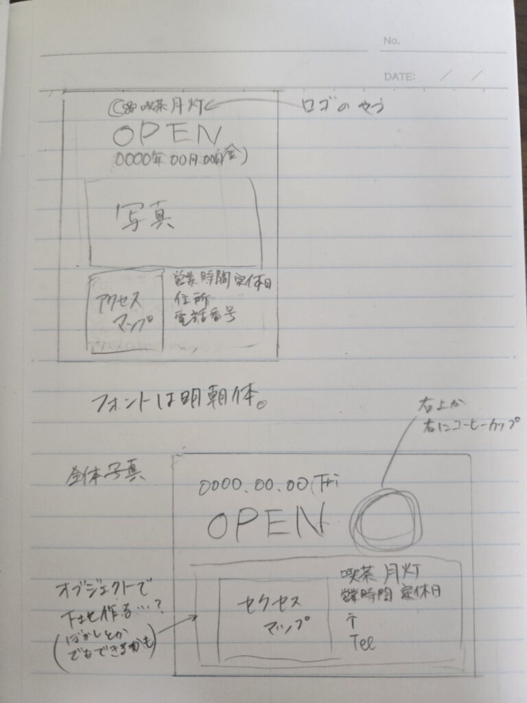 10月16日に作成したロゴを基に喫茶店オープンを想定したDMを作成。時間が足りず細かい調整がやりきれなかった。(主に2枚目の横型)
