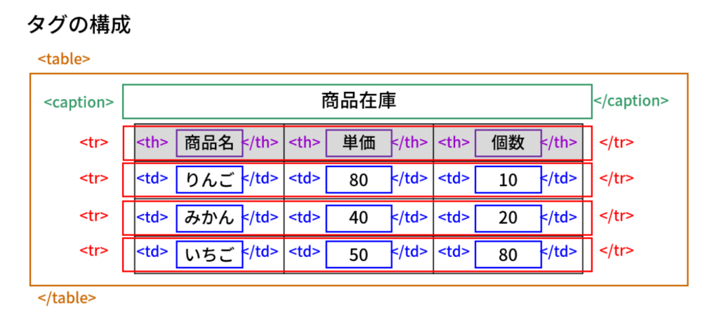 テーブルを作成するための先頭要素(親要素)は table 要素で、子要素を組み合わせてテーブル構成を作成する。