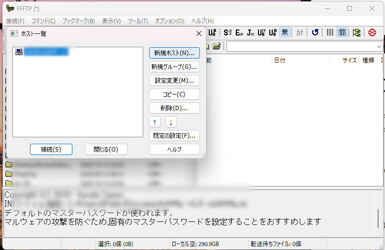 デスクトップにある FFFTP を起動する。→「新規ホスト」を押下。