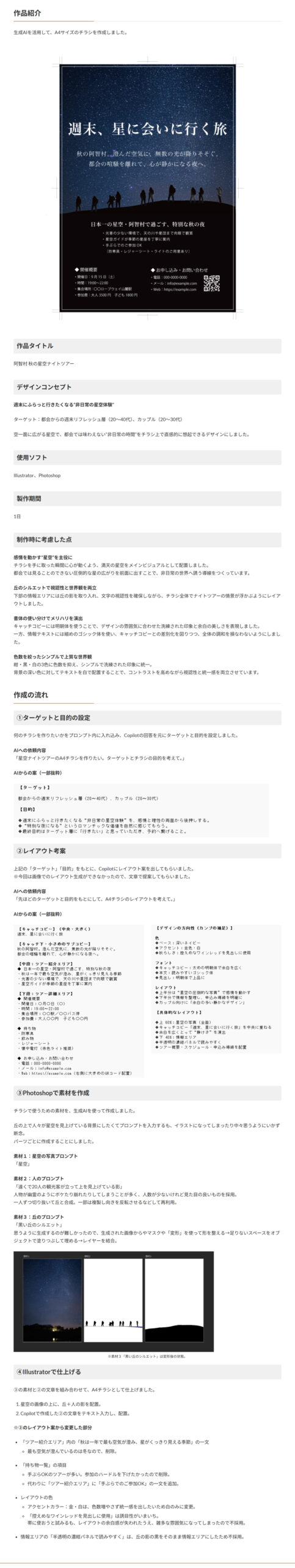 2026.01.31 学習記録 ~成績考査⑤~ 2026年1月31日 最終更新日時 : 2026年2月20日 Kumiko Okawara 成績考査の課題として、生成AIを使って制作した作品を紹介したページを作成した。固定ページに、どのように生成AIを使って作成したのか、制作過程や説明などをまとめた。